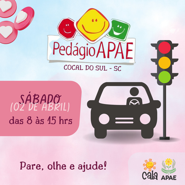 “Pare, olhe e ajude”, este é o lema do primeiro pedágio que a APAE de Cocal do Sul realizará em 2022. Será neste sábado, dia 2 de abril, das 8h às 15h nas vias municipais da cidade. “Serão seis pontos distribuídos pelo município, onde voluntários estarão pedindo a colaboração de quem passar pelos locais. Vale destacar que cada centavo conta em uma ação como esta, já que de centavo em centavo, conseguimos ótimos valores para nos ajudar a manter os trabalhos e projetos da nossa APAE”, destaca o presidente da Instituição, Pedro Bertan.