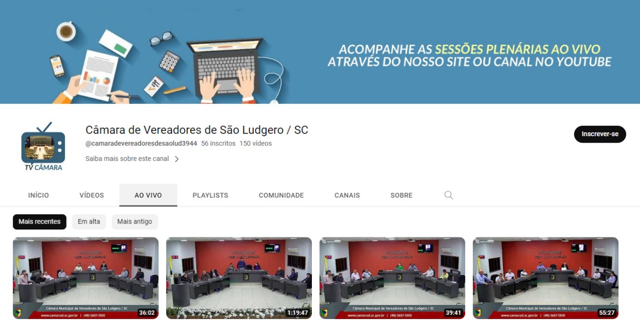 A transmissão das próximas sessões ordinárias, que serão realizadas nos dias 28/08/2023 e 04/09/2023, terão transmissão ao vivo apenas pelo Canal da Câmara de Vereadores de São Ludgero no YouTube. Isso ocorre devido a correções que estão sendo realizadas na Página da Câmara no Facebook.