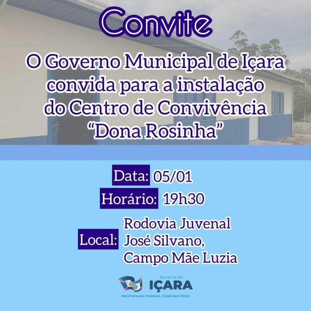 Início Cidades Convite: O governo Municipal de Içara convida para a instalação do centro... CidadesGeralIçara Convite: O governo Municipal de Içara convida para a instalação do centro de convivência “Dona Rosinha” janeiro 3, 2024 FacebookXPinterestWhatsApp ARTIGOS RELACIONADOSMais do autor Cidades Projeto de Capoeira 2026 tem início e atende cerca de 110 crianças acompanhadas pelo CRAS Agronegócio Comunidades rurais terão protagonismo na Olimpíada Rural da Maggiofest 2026 Cidades Rua 15 de Novembro tem interdições temporárias para avanço das obras de esgotamento sanitário
