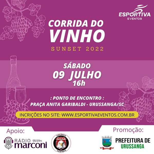 O Governo Municipal de Urussanga, através do Departamento Municipal de Esporte (DME), em parceria com a Esportiva Eventos, lançam a Corrida do Vinho – Sunset – 2022.