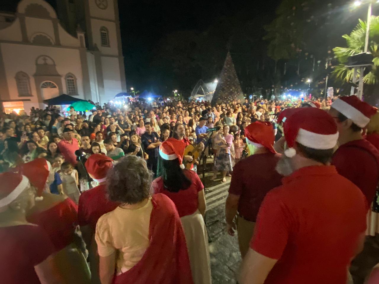 A chuva que caiu no final da tarde desta quarta-feira, dia 6, não intimidou o público de prestigiar o início do 2º Natal Encantado de Içara. Centenas de pessoas se reuniram na Praça da Matriz São Donato para receberem a chegada do Papai Noel e acompanharem o acendimento das luzes natalinas. A inauguração da Casa Temática, que será a morada do Bom Velhinho durante o mês, também foi um dos destaques da noite.