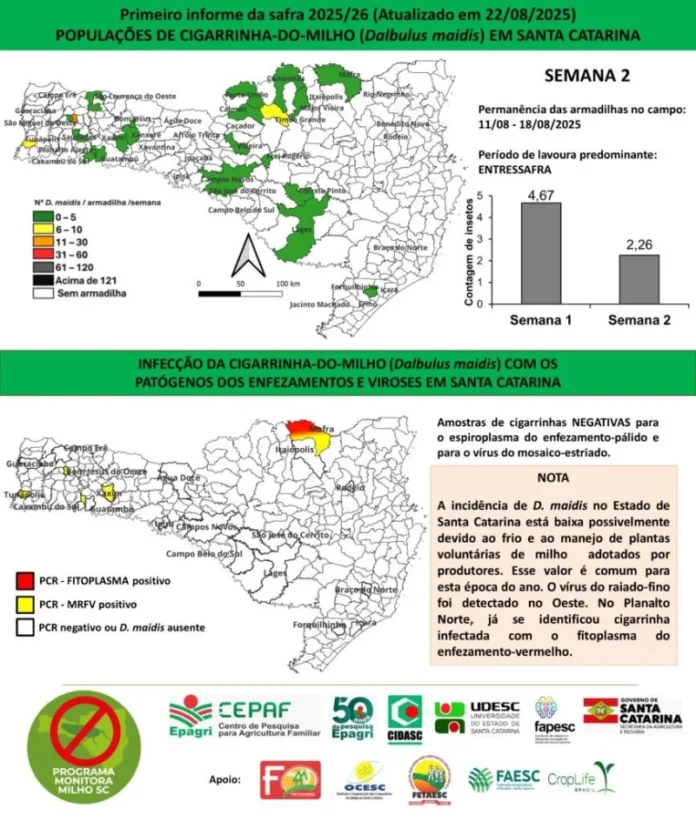 O programa Monitora Milho SC coleta e divulga semanalmente informações de todo o Estado, permitindo que o setor produtivo acompanhe a evolução da população de cigarrinhas e as infecções causadas por esses insetos.