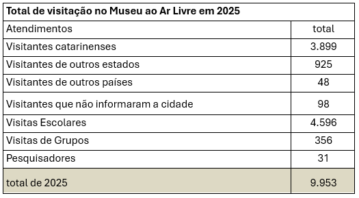 O Museu ao Ar Livre Princesa Isabel, em Orleans, registrou 9.953 visitantes ao longo de 2025. Quase metada, 4.596 foram estudantes que participaram de visitas organizados por em grupos escolares, especialmente em programações temáticas, como o Dia dos Povos Indígenas, em abril, e a Primavera dos Museus, realizada em setembro.