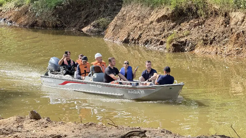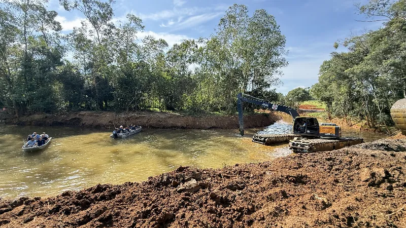Durante a agenda, as autoridades percorreram um trecho do rio de barco para observar diretamente como as atividades estão sendo executadas. Em Forquilhinha, o serviço de desassoreamento é realizado com o auxílio de uma máquina anfíbia, equipamento especializado que permite atuar diretamente dentro do leito do rio, retirando sedimentos e melhorando o fluxo da água.