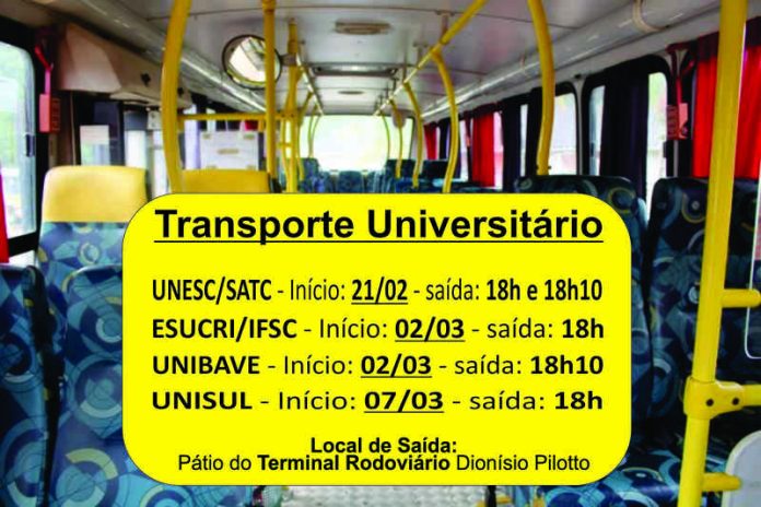 O Governo Municipal de Urussanga, através da Secretaria de Educação, informa os horários dos ônibus do Transporte Universitário para o início do ano letivo de 2022.