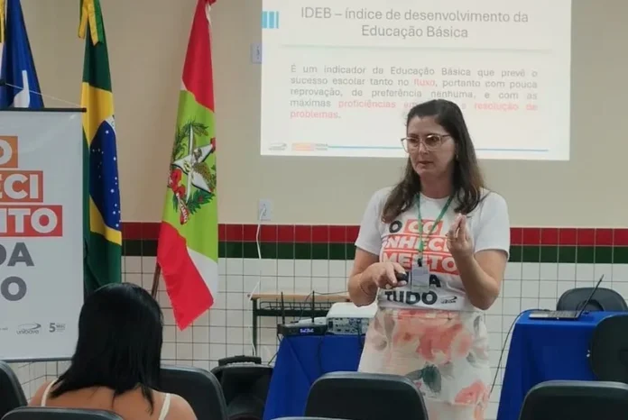 A formação faz parte das ações de contrapartida das Instituições de Ensino Superior (IES) junto ao Programa Universidade Gratuita, promovido pelo Governo do Estado de Santa Catarina. Com o tema “Avaliação da Aprendizagem”, a docente do Unibave, Rosilane Damazio Cachoeira, conduziu o encontro abordando aspectos essenciais da temática, como a avaliação como parte do planejamento, os diferentes instrumentos avaliativos e a interpretação dos dados do Índice de Desenvolvimento da Educação Básica (Ideb) para a elaboração de planos de ação.