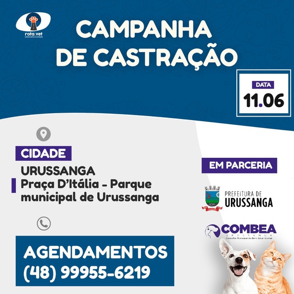 O Governo Municipal de Urussanga, através do Conselho Municipal de Bem-Estar Animal (COMBEA) irá realizar no dia 11 de junho, uma nova Campanha de Castração Animal.